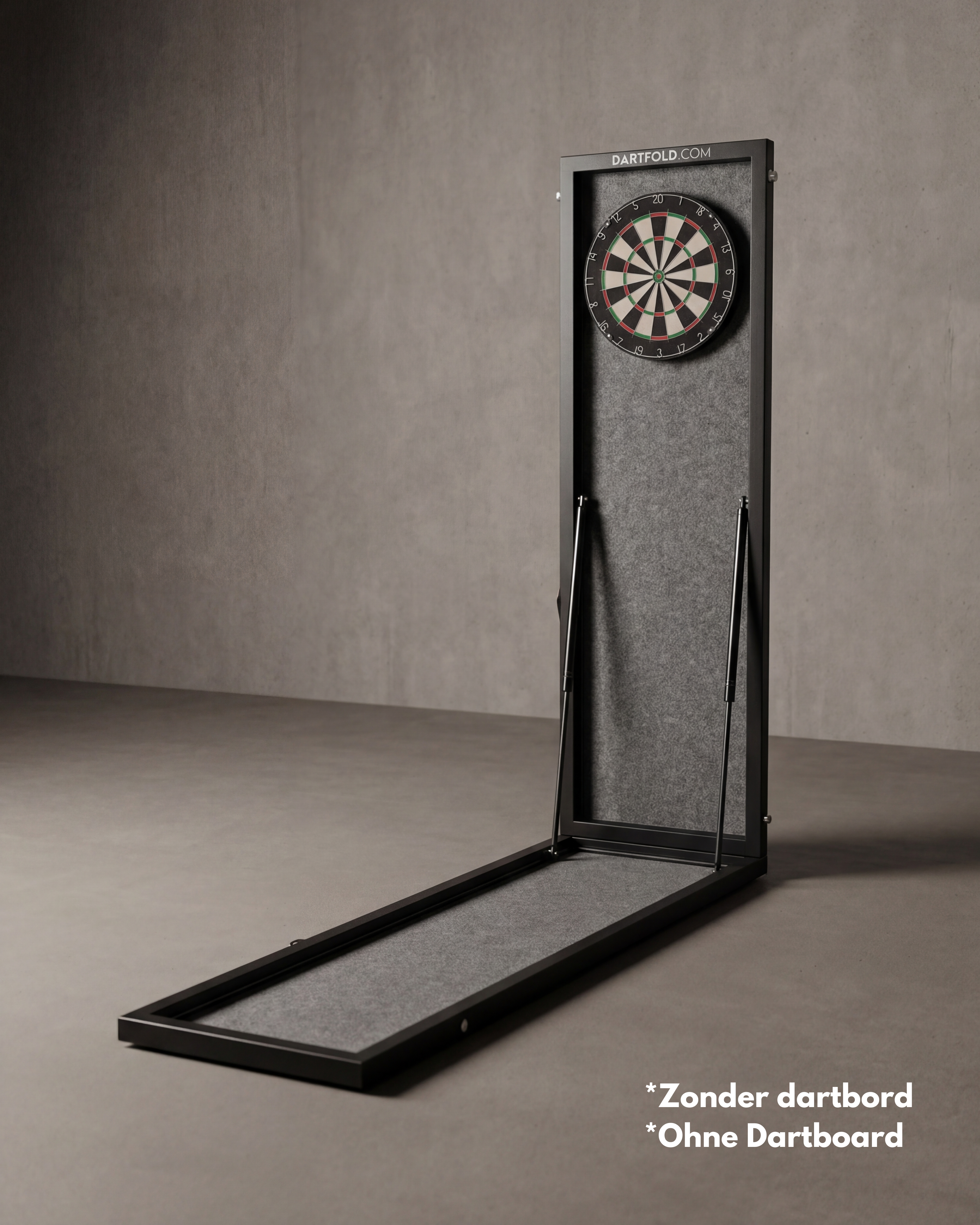 Zodra de Dartfold is uitgeklapt, staat de baan direct op de officiële wedstrijdafstanden. Het dartbord hangt op de juiste hoogte en de oche staat automatisch op de correcte afstand. Meten of afstellen is niet meer nodig.