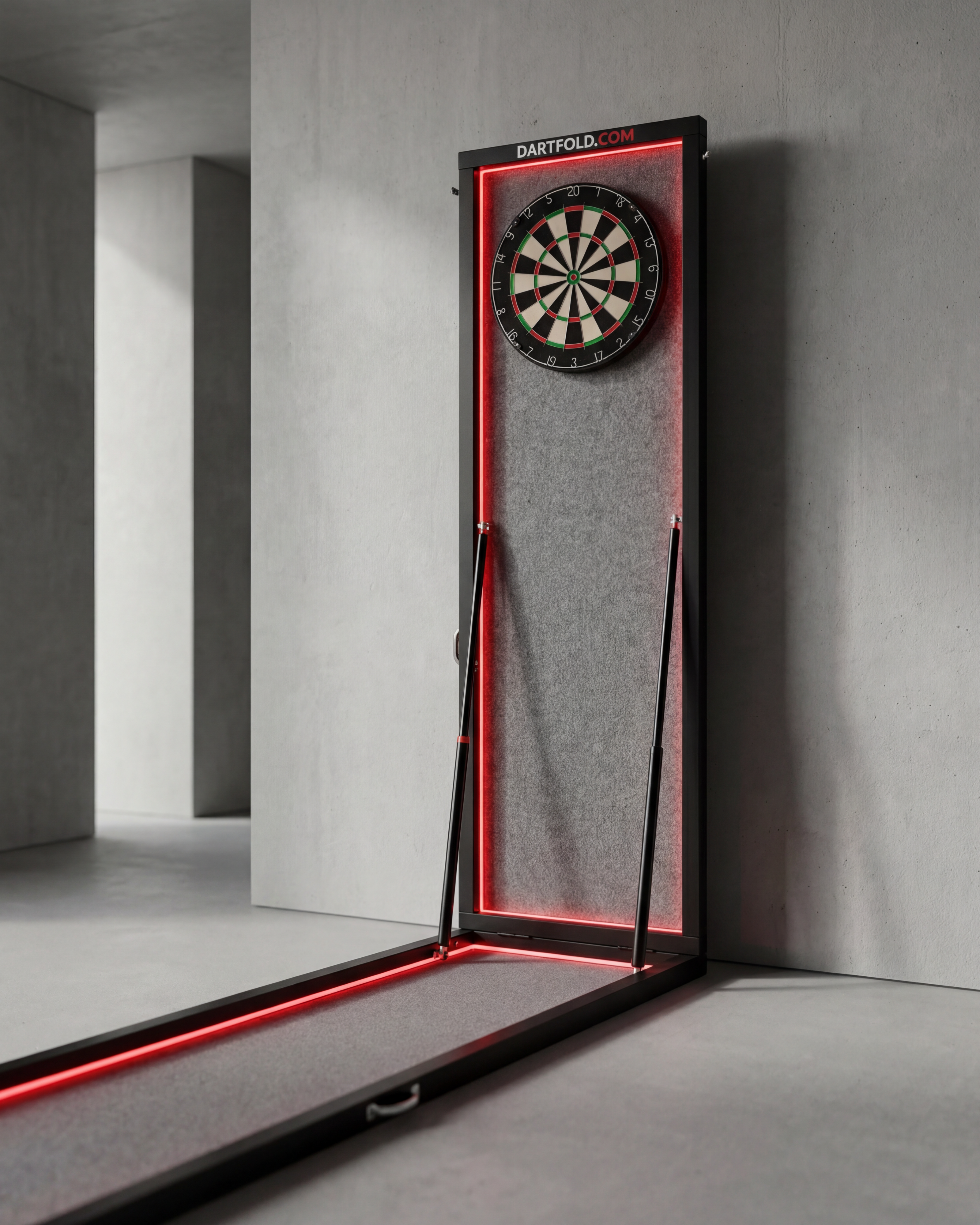 Zodra de Dartfold is uitgeklapt, staat de baan direct op de officiële wedstrijdafstanden. Het dartbord hangt op de juiste hoogte en de oche staat automatisch op de correcte afstand. Meten of afstellen is niet meer nodig.
