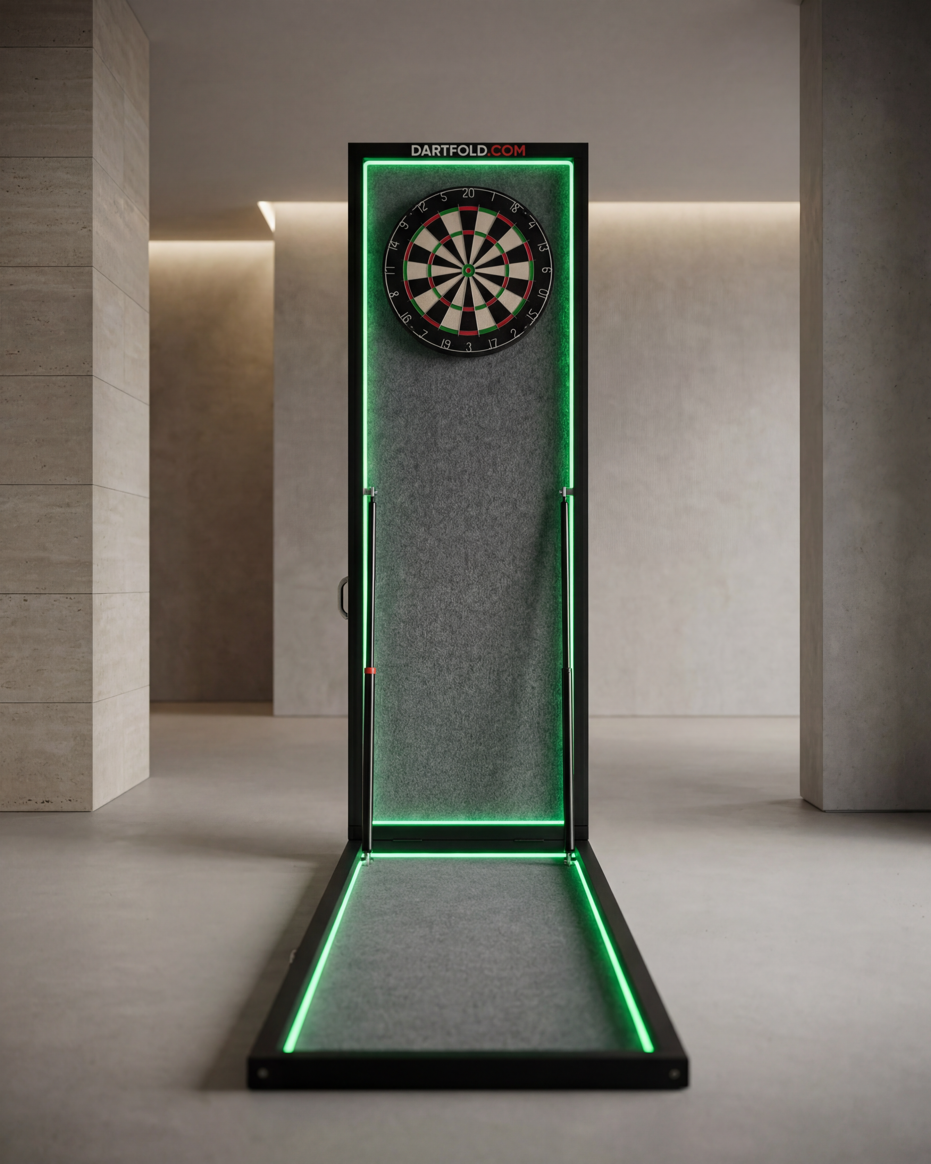 Zodra de Dartfold is uitgeklapt, staat de baan direct op de officiële wedstrijdafstanden. Het dartbord hangt op de juiste hoogte en de oche staat automatisch op de correcte afstand. Meten of afstellen is niet meer nodig.